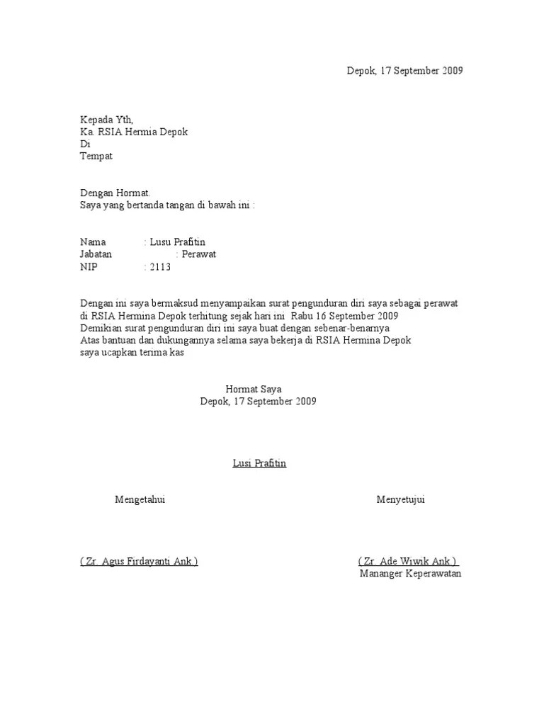Berikut beberapa contoh surat pengunduran diri atau surat resign dengan penulisan yang benar dan sopan, dilengkapi dengan trik dan tips melalui surat ini, saya basuki rahmat, bermaksud untuk mengundurkan diri dari pt. Penjelasan lengkap seputar contoh surat pengunduran diri (resign) sangat cocok untuk kamu jadikan referensi. Insan mulia sebagai karyawan terhitung sejak tanggal 17 september 2014. Melalui surat ini, saya dzawata afnan, hendak menyampaikan maksud saya untuk mengundurkan diri sebagai karyawan pt tirta company terhitung mulai tanggal 11 juni 2015. Bintang kecildengan hormat, melalui surat ini saya selaku karyawan pt.