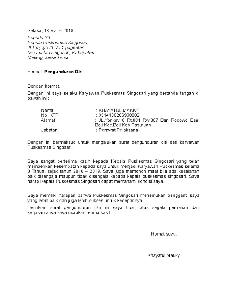 Contoh pengunduran diri dari puskesmas.