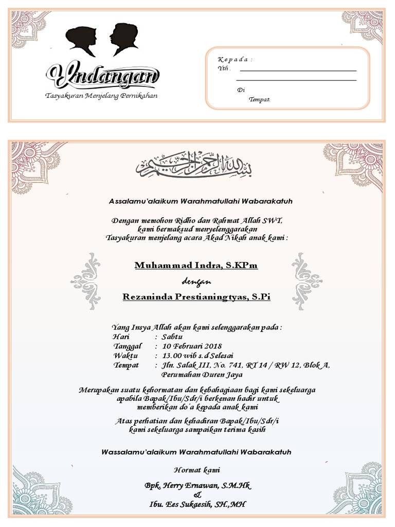 Seperti halnya undangan pernikahan berbahasa indonesia pada umumnya undangan pernikahan yang menggunakan bahasa jawa dimulai dengan salam. Saturday december 23rd 2017 design undangan. Surat undangan adalah surat yang dibuat dengan tujuan mengajak seseorang atau pihak lain untuk menghadiri sebuah acara tertentu. Ada beberapa contoh surat undangan yang tidak resmi seperti surat undangan syukuran kelahiran bayi atau aqiqahan, surat undangan hari ulang tahun dan surat undangan pernikahan. Surat ini merupakan sebuah pemberitahuan untuk hadir atau datang ke kegiatan atau. Bahasa indonesia bahasa indonesia adalah bahasa resmi negara kita. Wbsalam sejahtera contoh surat undangan dalam bahasa inggris untuk rapat perusahaan. Undangan, dalam bahasa indonesia berarti sebuah panggilan atau ajakan untuk datang atau hadir di acara yang diselenggarakan oleh orang yang mengundang. Contoh surat undangan pernikahan dalam bahasa inggris 1 y j. Lalu apa yang kamu lakukan agar orang. Setiap orang yang menikah tentu menginginkan untuk menikah hanya satu kali saja, walaupun pada kenyataanya banyak yang cerai dan akhirnya menikah kembali dengan. Surat undangan versi agama islam. Contoh surat undangan pernikahan paling lengkap untuk anda surat undangan pernikahan dibuat untuk memohon kehadiran orang lain dalam acara pernikahan yang akan dilaksanakan.