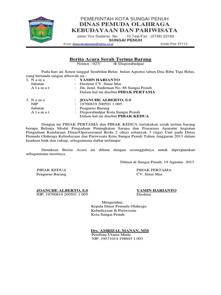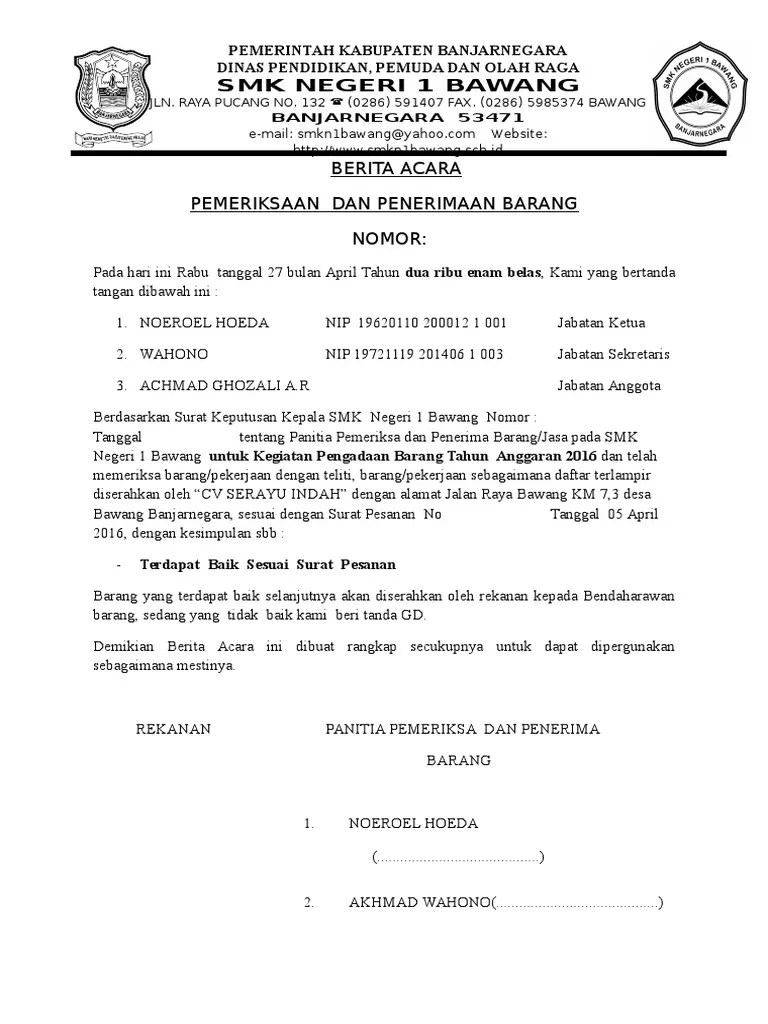 Contoh format berita acara serah terima lapangan/serah. 08/08/2021 · format 3 kop skpd berita acara pemeriksaan hasil pekerjaan nomor : Permintaan lanjutan inventarisasi kegiatan kajian, riset, dan buku pada tahun 2019. Barang yang diserahkan tersebut sebagaimana pada lampiran berita acara ini terdapat baik dan sesuai dengan ketentuan yang terdapat dalam surat perintah kerja. Klasifikasi kode surat dinas lengkap. Sd erlinga akan mengadakan acara seminar kerukunan dalam keberagaman. Berita acara serah terima barang inventaris. 26/10/2021 · berita acara pemeriksaan barang/jasa nomor : Isikan nomor berita acara pphp berdasarkan. Contoh surat resmi sekolah sd : Apabila barang tidak sesuai spesifikasi/kualitas yang dipesan/kurang/tidak baik dinyatakan dalam berita acara tidak baik dan diserahkan kembali ke penyedia barang. Salah satu perubahan utama dalam perpres 16/2018 tentang pengadaan barang/jasa adalah berubahanya nomenklatur pphp dari panitia/pejabatpenerima. Berita acara pemeriksaan barang/jasa nomor :